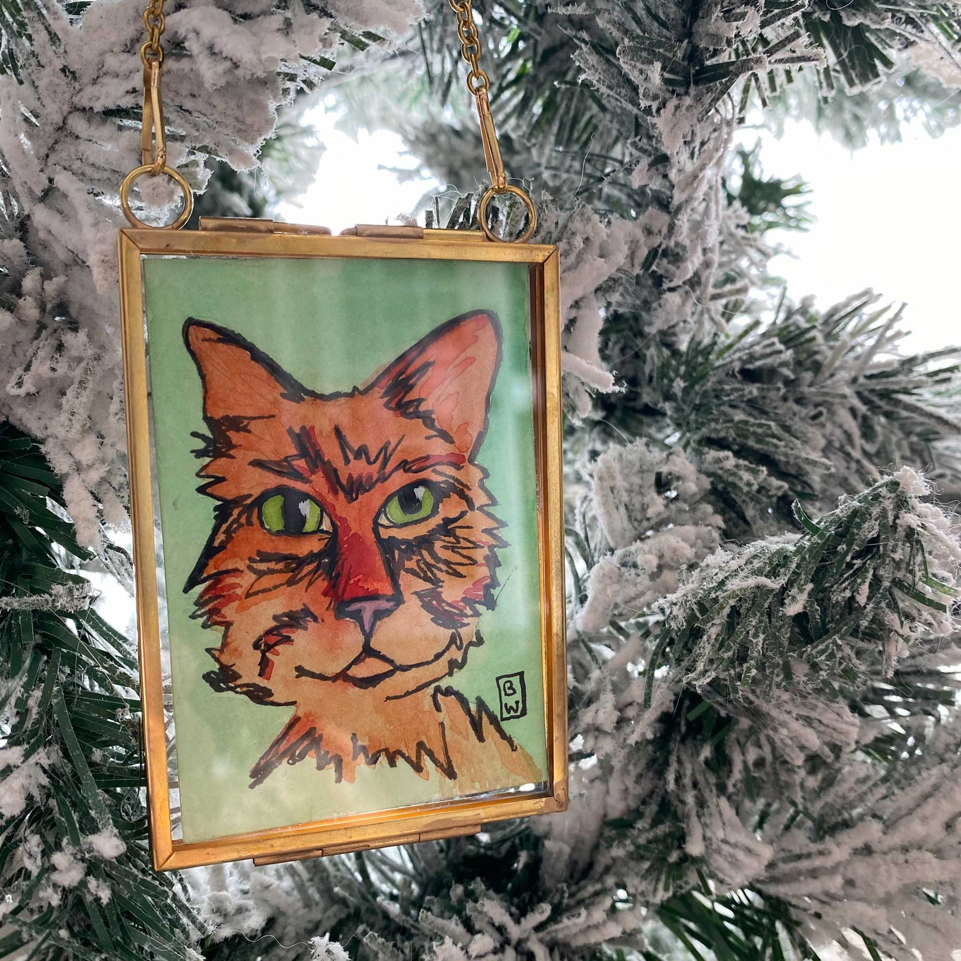 Each Quirky Cat miniature is a one-of-a-kind original gouache painting created by hand in my studio. These petite works feature artwork measuring slightly smaller than 2"x3" and come tucked inside a 2"x3" double-glass brass folding frame with a delicate hanging chain. The frame is included and arrives ready to hang, style or gift.